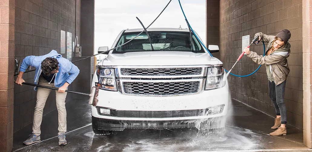 На мойке самообслуживания сначала используйте базовую пену: она размягчает грязь и песок. Дайте ей немного поработать и смойте водой, сбивая верхний слой загрязнений.